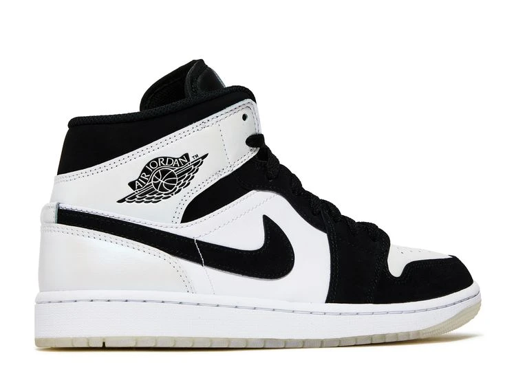 The Air Jordan 1 Mid SE โDiamondโ dresses the classic silhouette in a simple two-tone palette celebrating the 75th anniversary of the NBA. The mid-top carries an all-leather upper that combines a clean white base with contrasting black accents on the forefoot overlay, signature Swoosh, and mid-cut collar. The tongue tag displays classic Jumpman branding framed in a geometric shape that nods to the NBAโs diamond anniversary. A white rubber midsole features an encapsulated Air-sole unit in the heel and a milky white translucent rubber outsole underfoot.