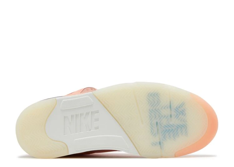 Drawn from the collaborative โWe the Bestโ collection, the DJ Khaled x Air Jordan 5 Retro โCrimson Blissโ gives the classic silhouette a pastel makeover. The upper is crafted from coral-hued leather with a satiny quilted lining in Leche Blue. Matching blue embroidery appears on each heel overlay, featuring a Nike Air logo on the right shoe and โWe the Bestโ inscribed on the left. Traditional Jumpman branding decorates the silver reflective tongue. The sneaker is mounted on an off-white polyurethane midsole with blue speckled shark-tooth detailing and a visible Air-sole unit in the heel. Underfoot, translucent rubber outsoles reveal mismatched Jumpman and โWe the Bestโ branding.