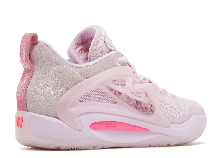 The Nike KD 15 NRG ‘Aunt Pearl’ honors a lasting influence in Kevin Durant’s life. Through several iterations of KD’s signature line, Nike has paid homage to the athlete’s late Aunt Pearl with a tonal pink finish and unique details. This pair features a floral print throughout the upper, built with a combination of mesh, suede and molded TPU. Crushed velvet tongues are marked with KD patches, while ‘Aunt Pearl’ is inscribed on the right pull tab. Performance benefits include a full-length Cushlon midsole and a visible Air Zoom Strobel unit.