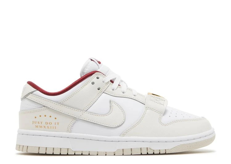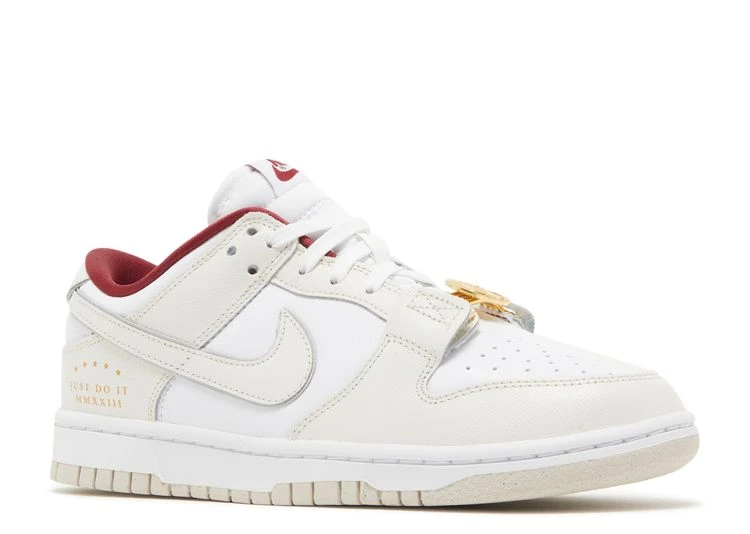 The Nike Womenโs Dunk Low SE โSisterhoodโ showcases a subdued two-tone design celebrating women in sports. Textured leather is deployed on the upper, featuring a white base with cream-colored overlays and a matching signature Swoosh. Contrasting Team Red accents make their way to the interior lining and woven Nike tongue tag. Pendant-shaped lace jewels shine in metallic gold, while โJust Do It MMXXIIIโ inscribed on the latera heel gold-foil lettering. Anchoring the sneaker is a traditional cupsole that pairs white sidewalls with a tan rubber outsole.